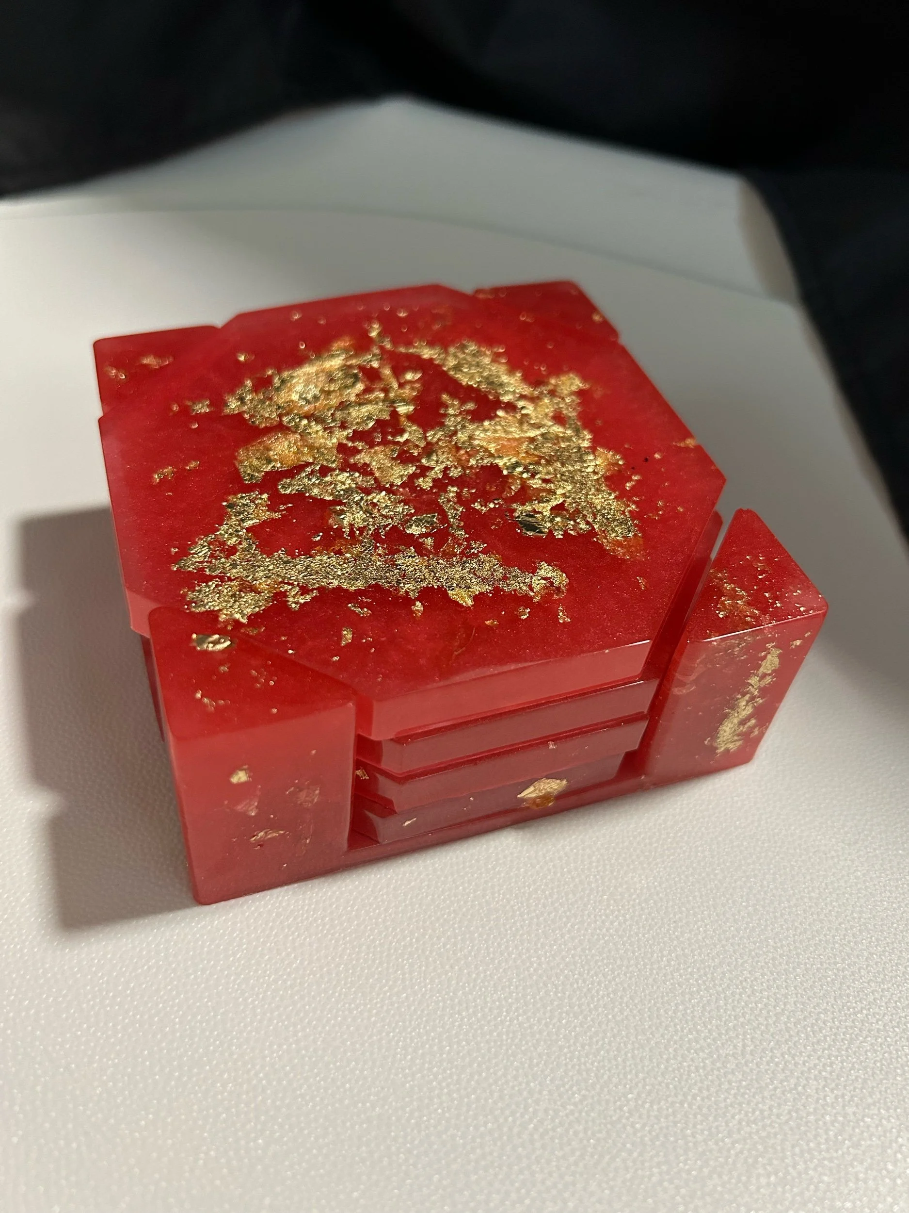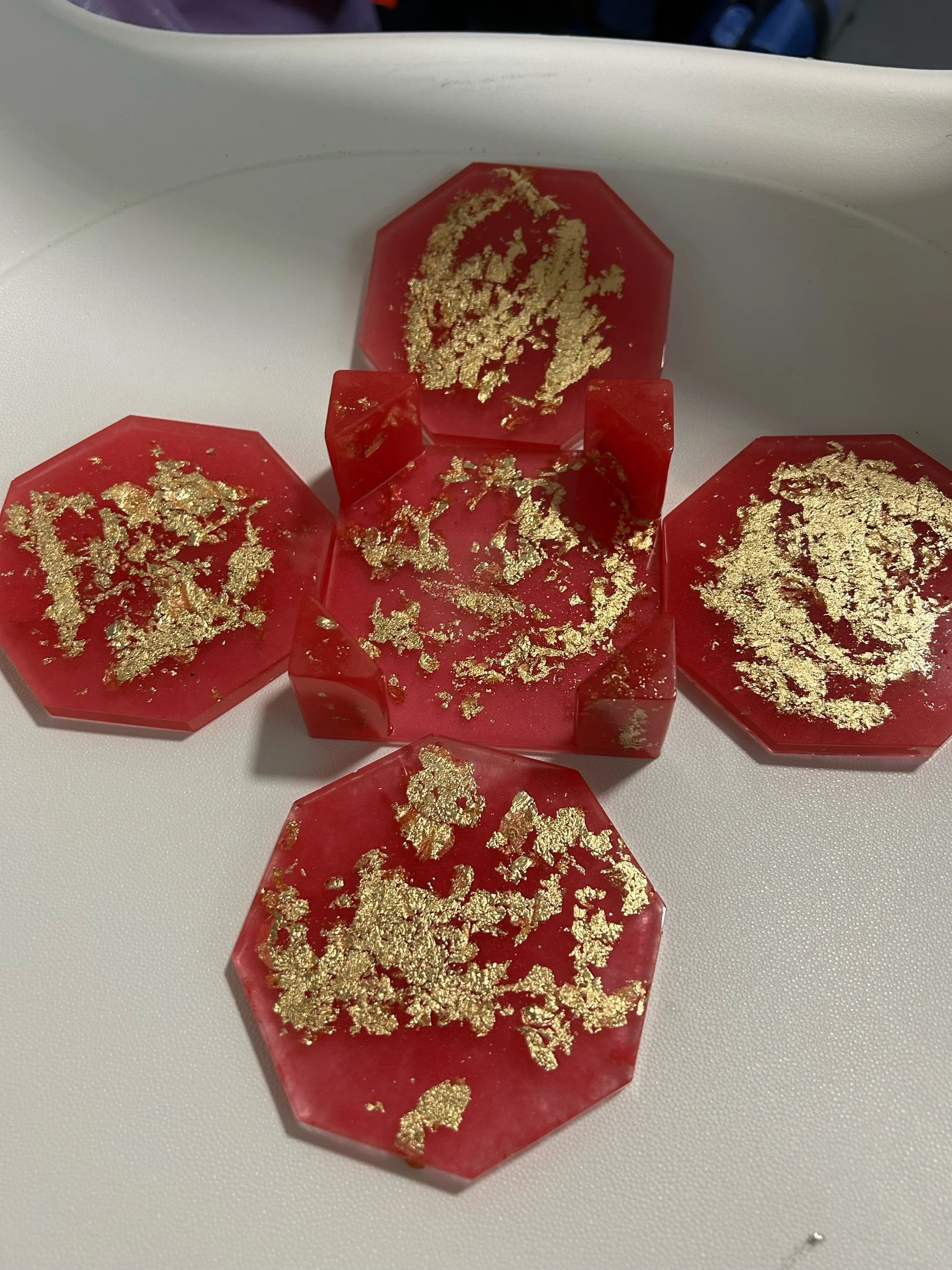 Store › Coaster set with holder Image 1 of 2 Image 2 of 2 Coaster set with holder £10.00 Handmade resin set of four coasters and a holder. Different colours and designs available. Quantity: Purchase Added! Handmade resin set of four coasters and a holder. Different colours and designs available.